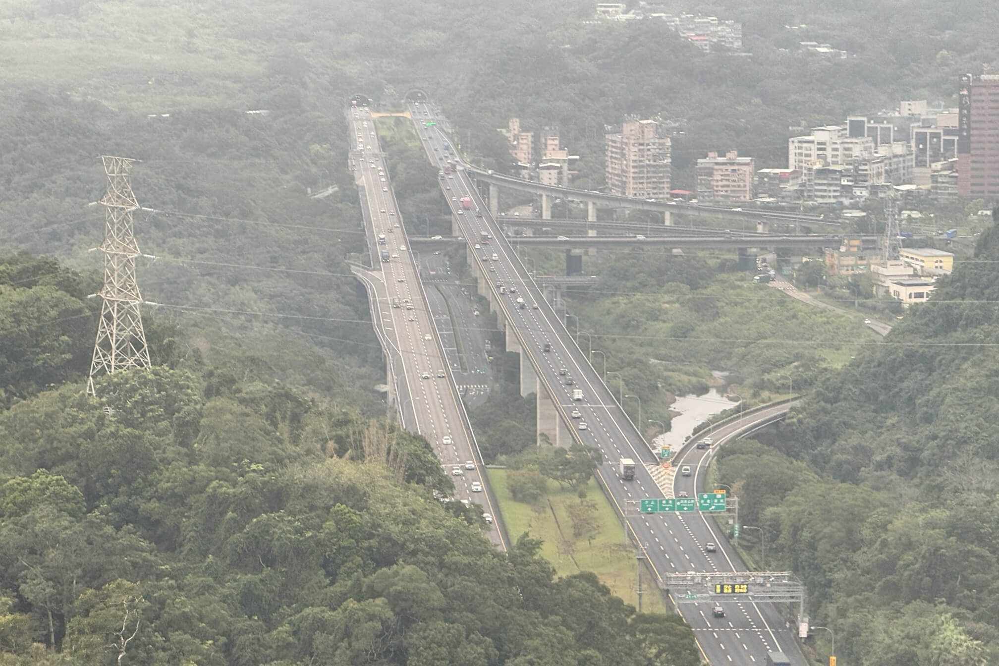 ↓北二高的「木柵交流道」。以往都是從高速公路上觀看高空中的貓纜,今天角色互換,變成從纜車上觀看高速公路上的車況。