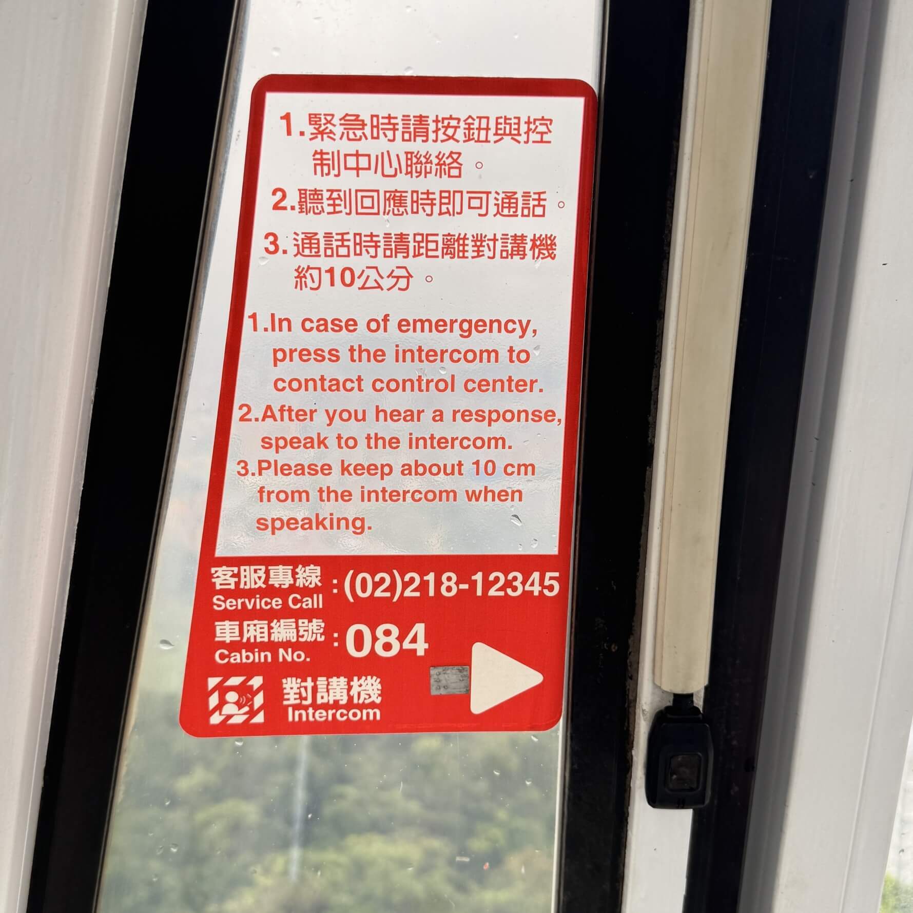 ↓車廂內有按鈕對講機,若遇緊急狀況時可與控制中心聯絡;而每一節車廂都有編號(本車廂為084號),可以清楚溝通,並讓控制中心做緊急應變。