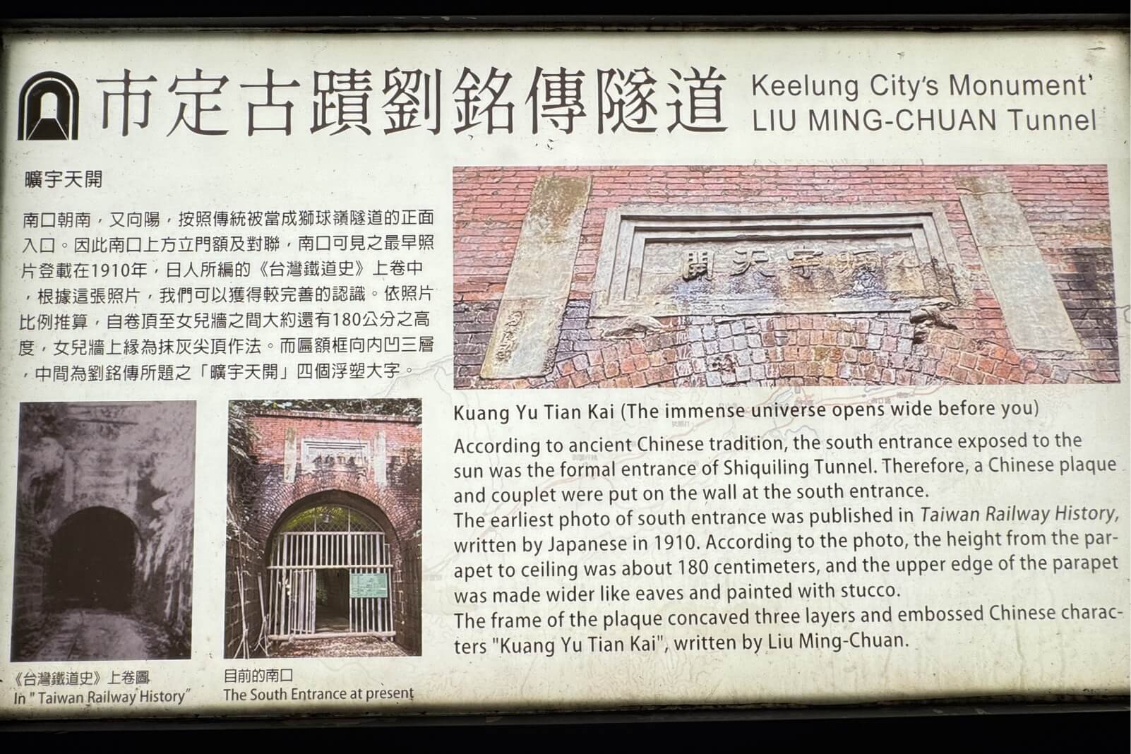 ↓依照傳統坐北朝南、南面稱王的概念,隧道南口被視為隧道的入口,牆上有劉銘傳題匾的「曠宇天開」及對聯,都是台灣史上重要的史料。