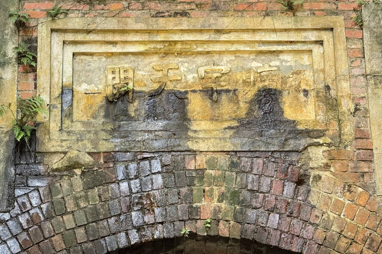 ↓「曠宇天開」題匾落在三層內凹的隧道口上,字跡尚稱清晰,不過兩側的對聯則無從辨識。