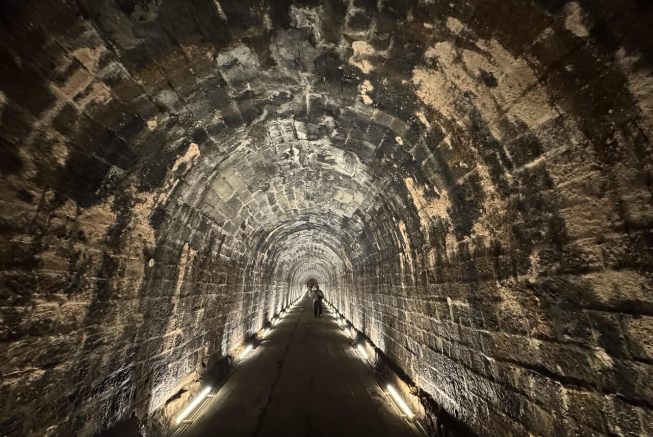 ↓紅磚拱頂上有明顯的黑色痕跡,是當年燒煤的火車機車頭通過時,日積月累的煤煙所造成的燻斑。