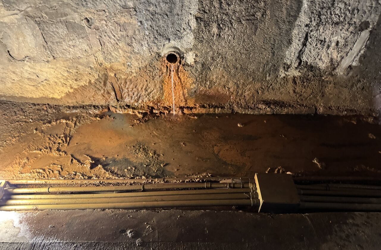 ↓隧道內的紅磚,比石材更容易風化脫落,部分紅磚因為風化嚴重,造成磚面凹凸不平,也滲出少量的水流及泥沙,覆蓋在磚壁上。