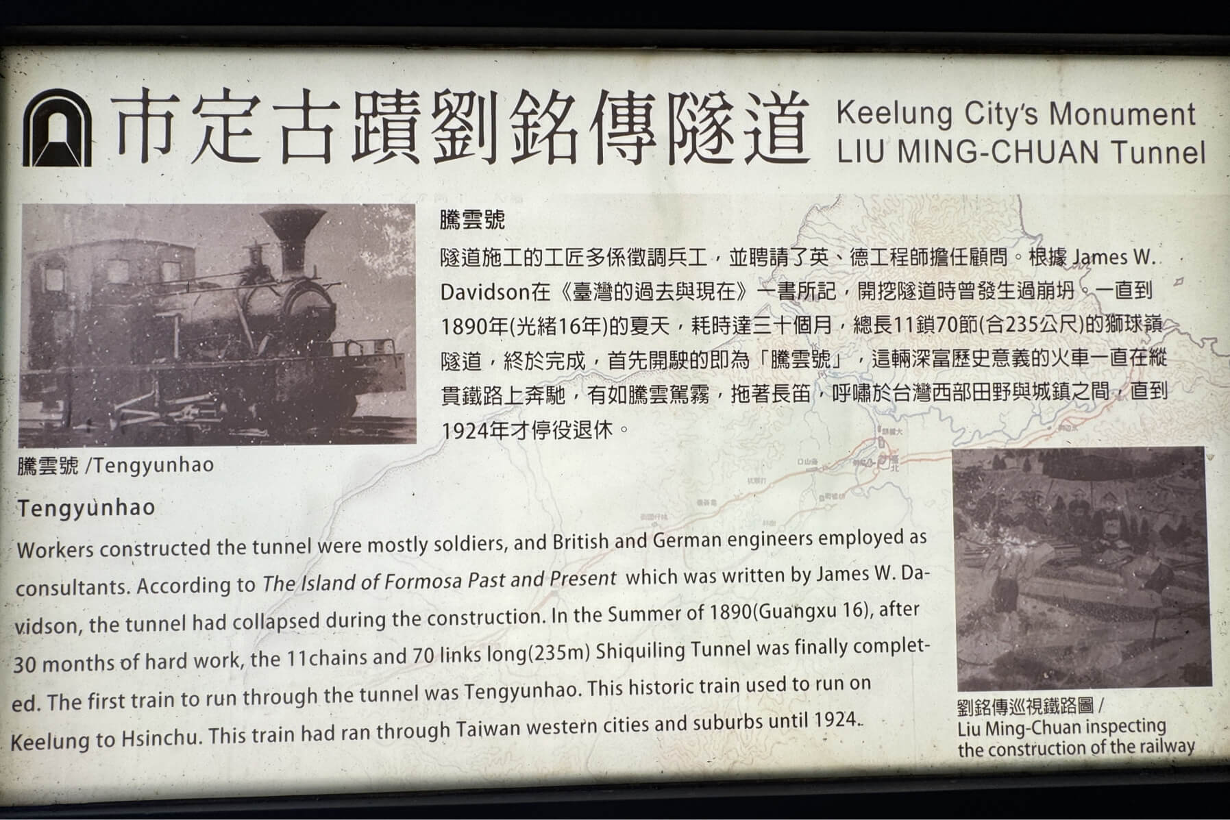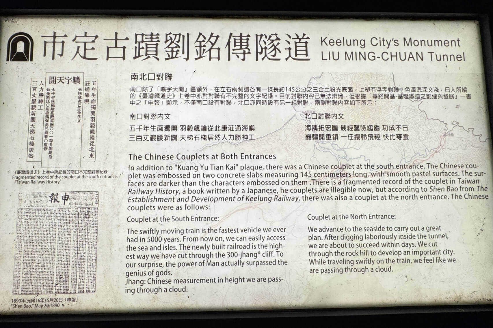 ↓依據清光緒16年(1890年)出版的《蓽路開基-基隆鐵道之創建與發展》一書中之「申報」顯示,隧道南北兩口,都有對聯。