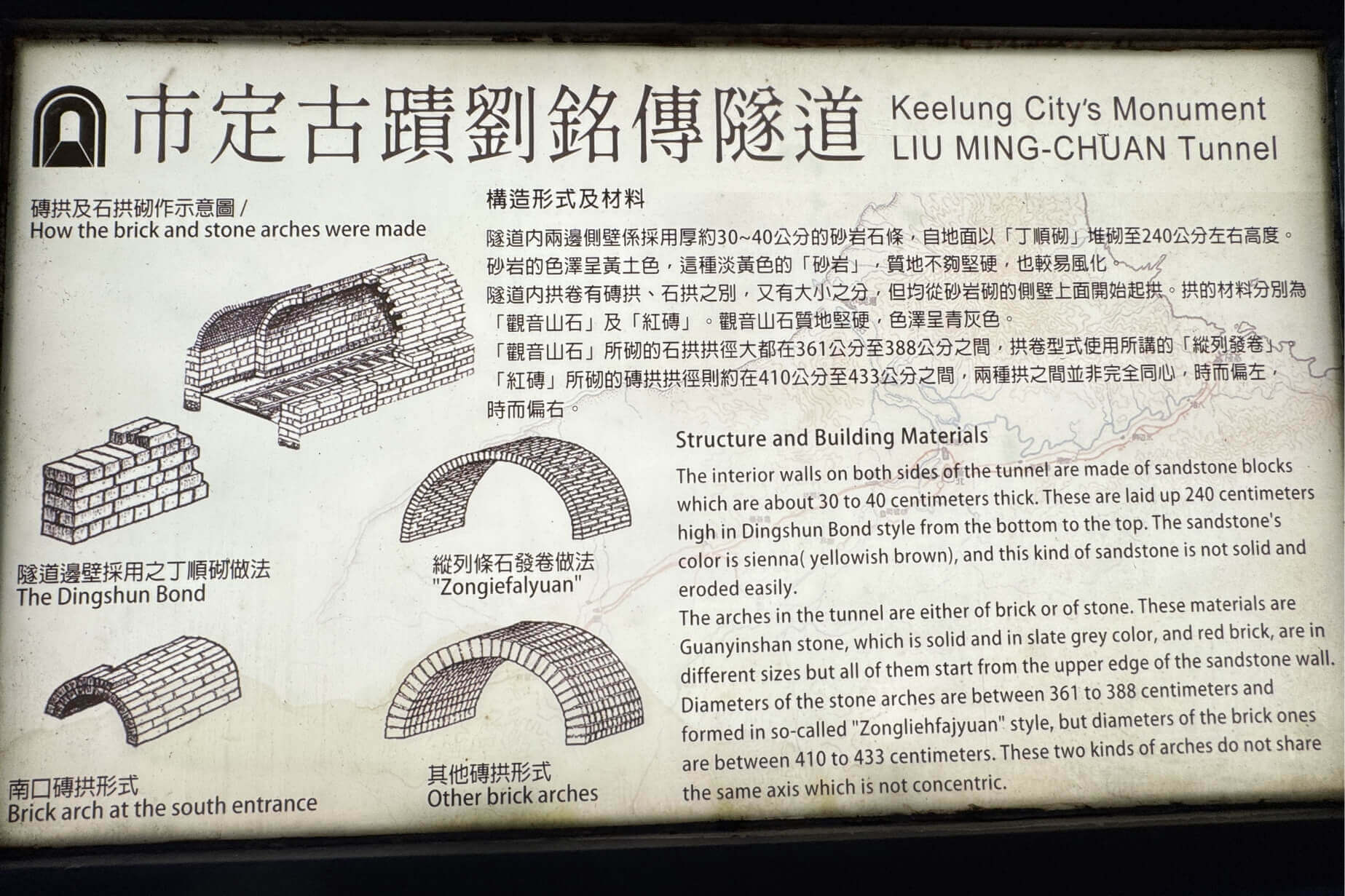 ↓磚拱及石拱的砌作示意圖。劉銘傳隧道的拱座材料,主要是質地堅硬的觀音山石及紅磚。