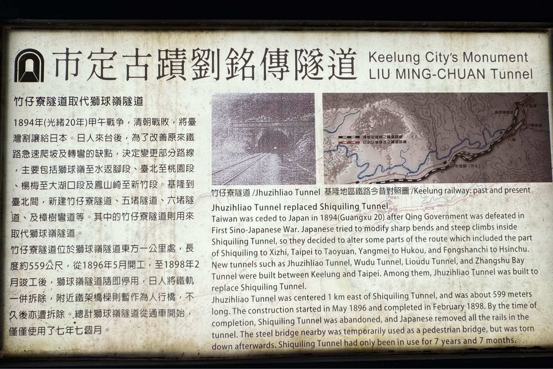 ↓劉銘傳所開闢從基隆到新竹的鐵路,其中就屬基隆的獅球嶺及新莊往桃園龜山的龜崙嶺(萬壽路)最陡峻及彎曲。日本治台後,決定改變路線,包含上述兩路段。新路線於1898年完工,獅球嶺隧道從1890年通車後,僅使用了7年多。