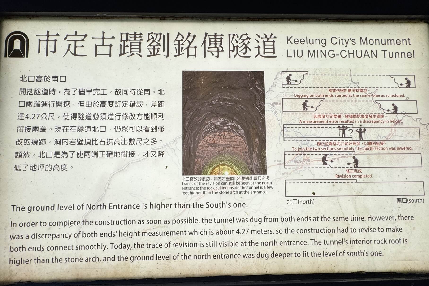 ↓劉銘傳隧道還有個有趣的現象。當年是從兩端同時開挖,卻因高度測量失準,接近相通時,高低竟落差達4.27公尺,隨後以降低地坪的高度解決。這種現象(品質),以現代的工程技術眼光來看,簡直是兒戲。