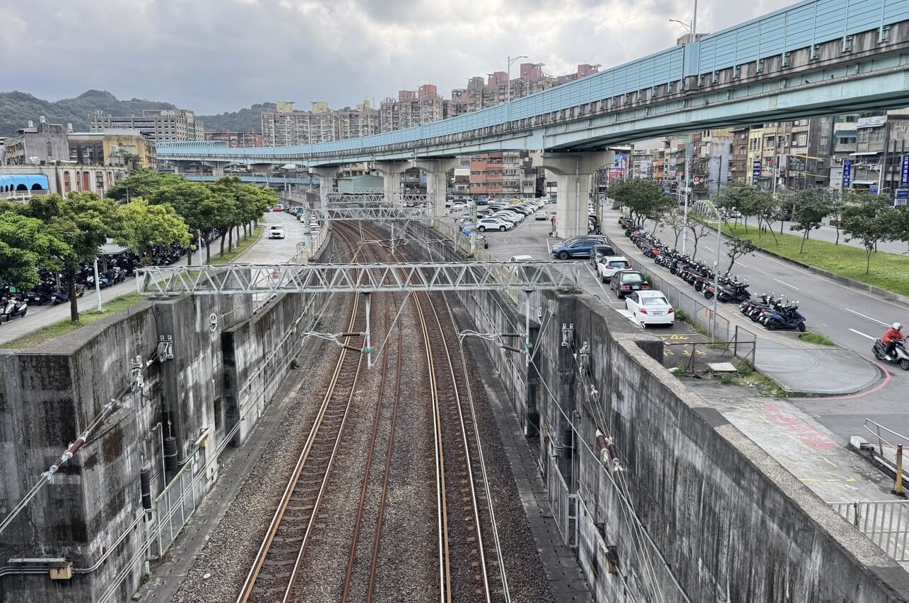 ↓陸橋跨越台鐵縱貫線,時間掌握得宜,還可欣賞火車緩緩自基隆車站蜿蜒駛出的美景;右側則是長長的高速公路延伸道。