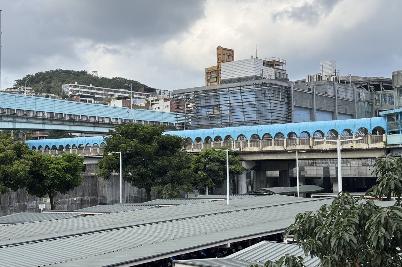 ↓中山陸橋是一條人行陸橋,位於基隆高速公路延伸道、台鐵縱貫線、中山一路間,擁有曲形迴廊與拱形藍色遮雨棚,外觀上宛如一座大型的藝術作品。
