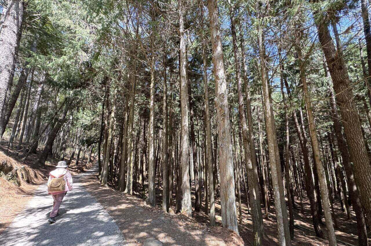 ↓一開始,步道兩旁遍植「台灣二葉松」、「台灣赤楊」等針闊葉樹的造林地,高聳蔽天。