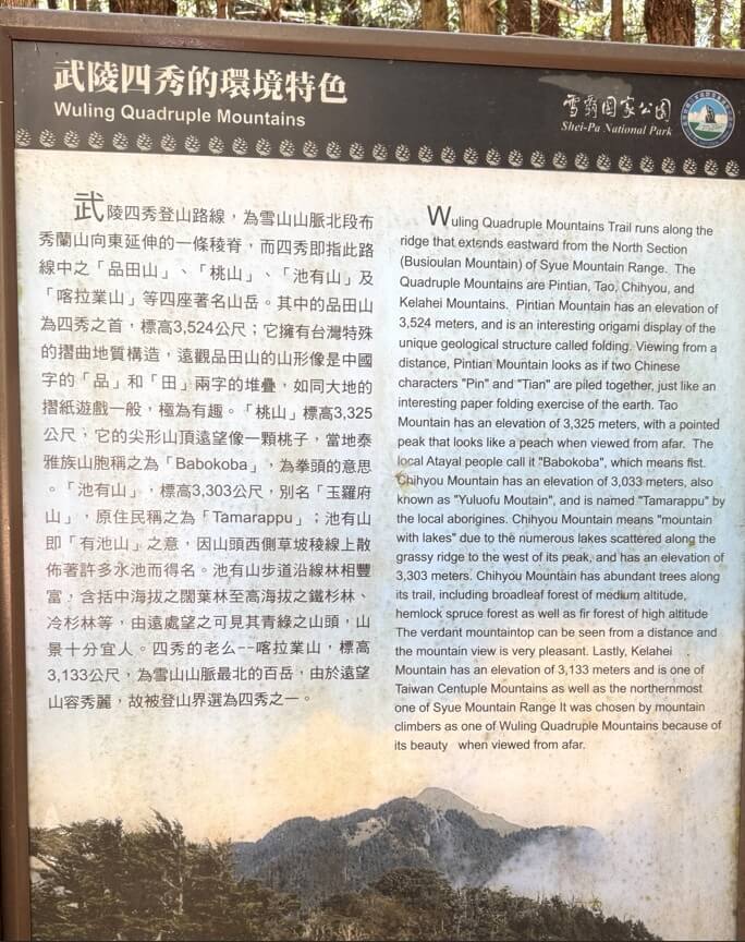 ↓雪霸國家公園內的「雪山山脈」,有四座赫赫有名的山頭,號稱「武陵四秀」,分別為:「品田山」、「桃山」、「池有山」及「喀拉業山」,都在桃山瀑布步道周邊,都屬於【台灣百岳】,其中,品田山為四秀之首,標高3,524公尺。