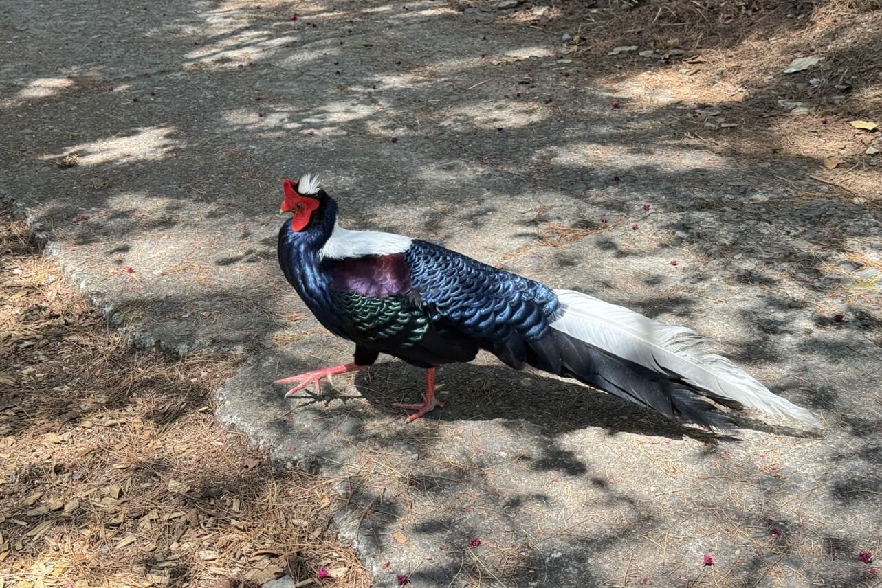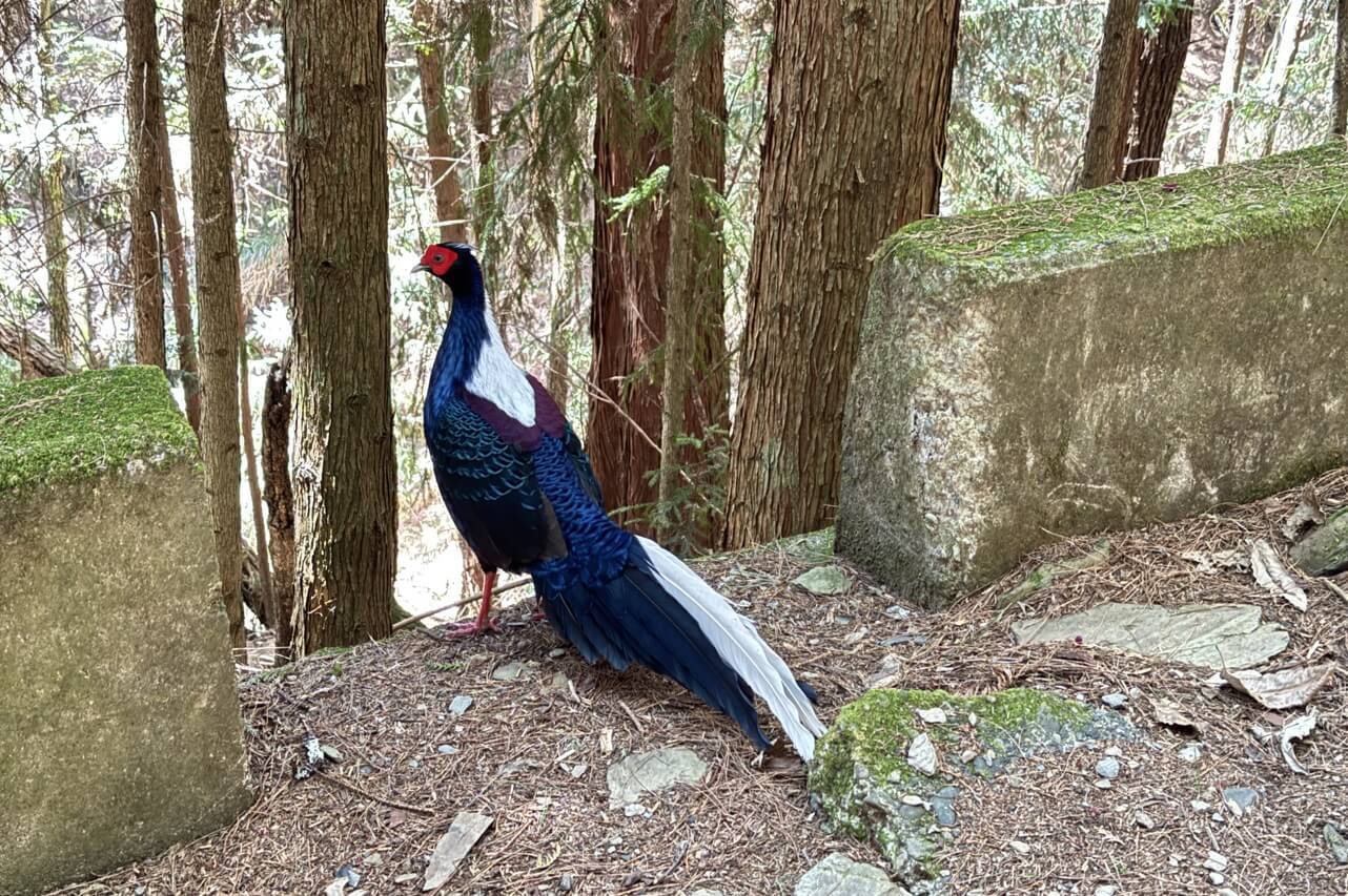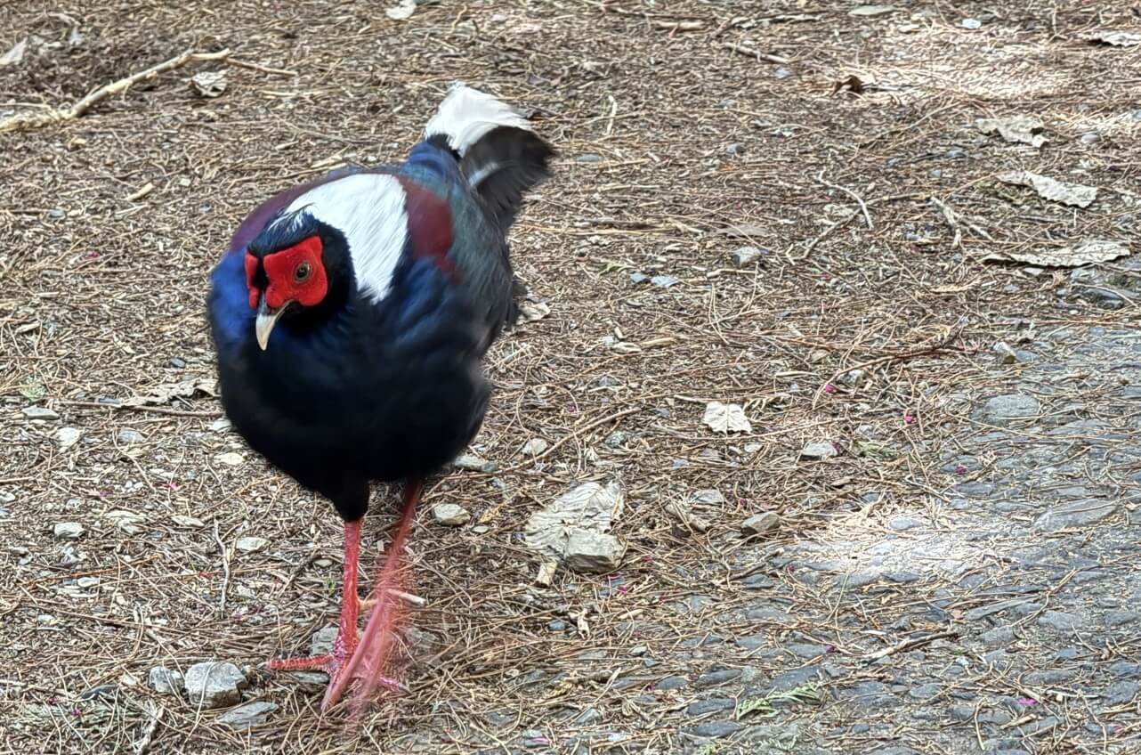 ↓這是一隻公的藍腹鷴,有面紅、白頭髮、赤腳、漂亮羽毛的特徵。