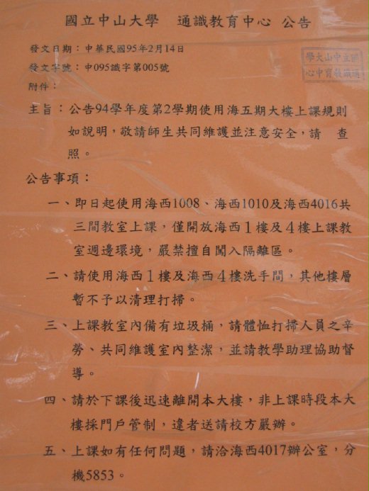 國立中山大學海洋科學學院第五期新建工程去年底驗收,大樓因故尚未取得使用執照,卻已有部分通識課程在大樓內進行,引起學生對安全性的質疑。校方表示,目前是暫行權宜,少量試用教室空間,使用執照應在1個月內完成。