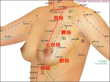 那是中醫講的氣滯現像,小葉增生在左邊是舒泄肝氣為主,在右邊是為脾解郁為主,無論左右,關鍵是生氣,可以壓乳房外側一排的地方,那兒主要是脾經,肝經有一部分路過。