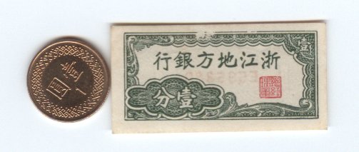 這世界最小票幅紙幣可又是我中華民國的光榮紀錄,它是浙江省地方銀行發行壹分面額紙鈔。只有長