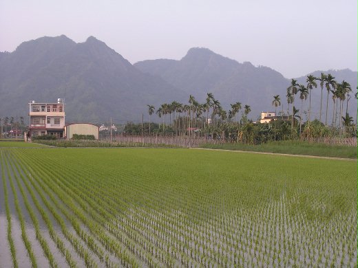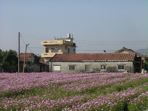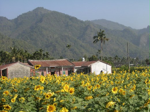 那紅磚砌成的三合院房子,是如此的踏實溫馨,門前有小河,後面是山坡,四周是花田,有紅、紫、白、黃...千百種顏色舖成的七彩地毯,高高檳榔樹和新插下的秧田,結合水中倒影構出一幅祥和的畫頁。