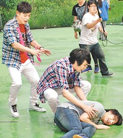 (圖)晟敏(前)原地轉10圈後倒地,梁赫群(中)、阿Ken(後左)趕緊上前關心。
