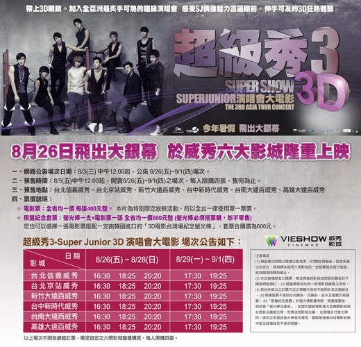 「超級秀3-SUPER JUNIOR 3D演唱會大電影」各戲院座位場次資訊 2011/08/10