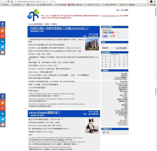 有天,當我在搜尋一個中翻英的單字時,無意中發現了這個Teacher Sammy的英文部落格,裡面的內容十分豐富,有英文常識、英文句子閱讀解析、英文寫作格式和標點、英文俏皮話、常見英文錯誤、英文字彙片語 ...等,文章的內容寫得清楚易懂,如果你覺得學得意猶未盡的話,可以報名她的英文班做更進一步的學習,不過她的班只開在台北,其他縣市的人只能望梅止渴了。
