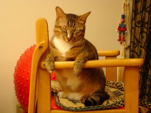 可能從小接觸人類,一哲和我們很親近,孩子唸書、寫功課,他會伴讀─坐在功課上,冬天他會幫我暖被─鑽進被窩裡ㄎㄟˋ ㄒㄧㄛ,種花他會幫忙─啃掉一大半的葉子,連做家事他都喜歡看,有一次他坐在兒童餐椅上看我摺衣服,看著看著竟打起瞌睡呢!
