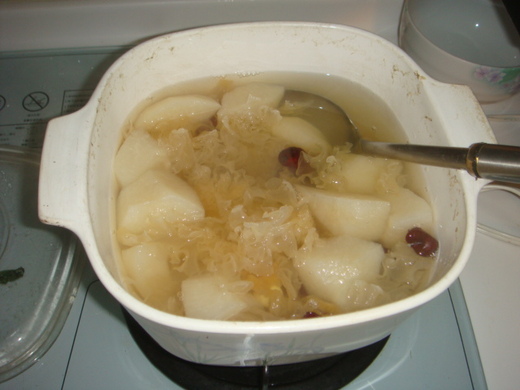 下圖, 喵 與 雞蛋孃 合煮的 冰糖銀耳水梨紅棗蓮子湯! 好喝!
