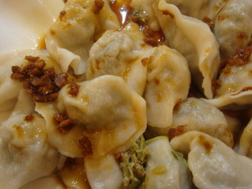 手擀皮的喔 白菜餡的吧 搭配著豆瓣醬看起來好吃 不過我更愛韭菜餡的
