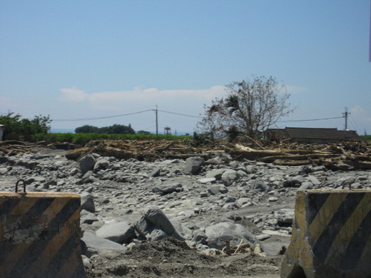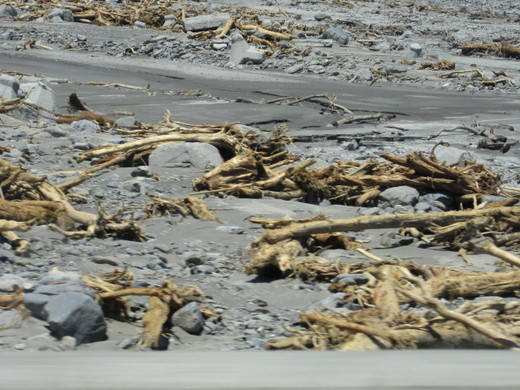 中圖 & 下圖, 雖然水退了, 但 滿目瘡痍的 河床上卻佈滿了 數不盡的 漂流木, 因為是 政府的資產, 老百姓 也只能看, 不能動手了!