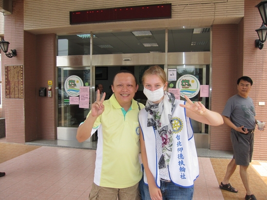 下圖, 爵士 與 德國籍的交換學生 Kim 合影! 她因為水土不服, 得了 夏季熱感冒 (室外超熱, 室內超冷), 爲了大家的健康, 她戴上口罩, 很有公德心喔! 希望大家可以多跟她學習!