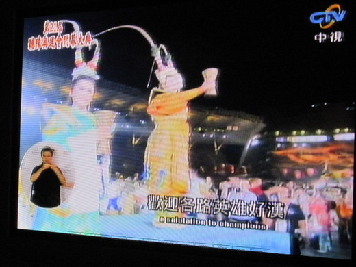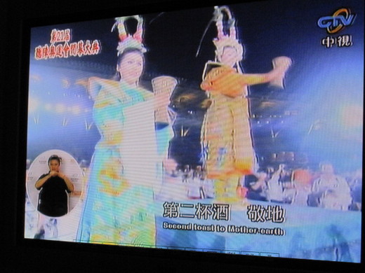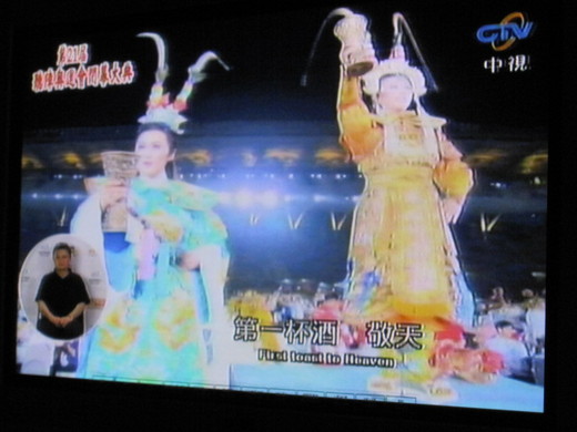 這三張圖 取材自 中視, 都是由 明華園 的 主角 孫翠鳳女士 帶領大家敬的這三杯酒, 第一杯 敬天, 第二杯 敬地, 第三杯 歡迎各路英雄好漢!