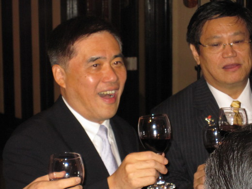 下圖, 也許, 郝市長 實在是太感謝 扶輪人 了! 一進門就跟每一位在場的人握手, 致詞後, 還特別留下十分鐘, 跟每一桌敬酒! 身段放得超低, 誠意也很足! 還開玩笑說, 可惜這次只給大家兩個禮拜服務的時間, 不過, 明年還有個 長達半年的 花博會, 如果扶輪先進還有興趣的話, 歡迎再次參予服務的行列!