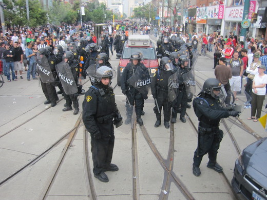因為今年這兩場重大的國際會議, 都在 加拿大 的東岸舉行, 所以, 在警力與警車調配嚴重不足的情況下, 不但各地的警力被調到 這兩個城市, 一時間整個市區都空蕩蕩的, 取而代之的是 各種荷槍實彈的 特種部隊!