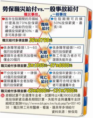 涵蓋約八百八十萬名勞工的勞工保險,目前給付可分普通事故(即一般事故)與職災給付兩類,勞工是否可領較高勞保職災給付,由勞保局根據「勞工保險被保險人因執行職務而致傷病審查準則」認定,以職災死亡為例,認定為職災最多可多領一百三十多萬元。