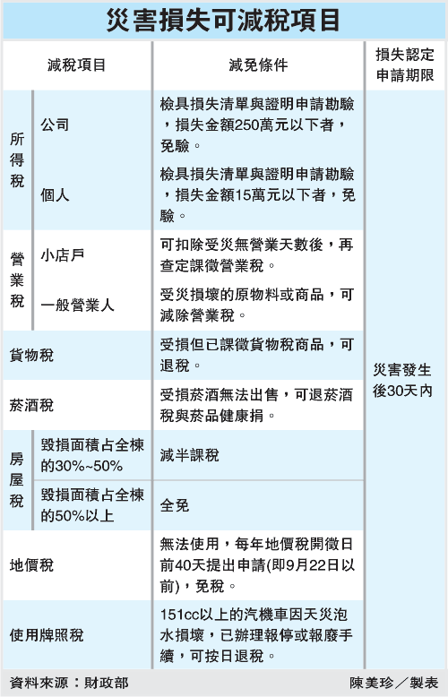 財政部放寬天災損失的抵稅限制,納稅人遭受不可抗力的災害損失,不僅報備期限一律自15日延長為30日,因故未向稅捐機關申請派員勘驗損失者,仍可自行檢據證明要求抵稅,災損從此不必「自行吸收」。
