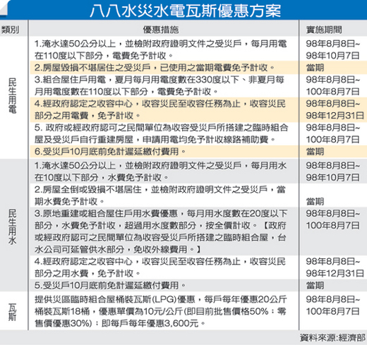 經濟部邀集國營會及台電、中油、台水開會研商,對於規劃採行之各項優惠措施,已獲具體共識,只要是淹水達50公分以上,並檢附政府證明文件的受災戶,2個月水電費減免(每月用電度數110度以下、用水度數10度以下)。