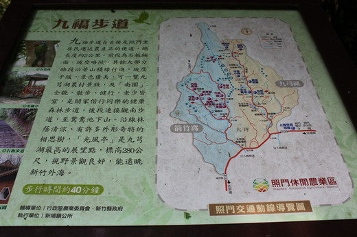 九福步道位於新竹新埔照門的的九芎湖休閒農業區,秀麗的農村風情、純樸的人文風情,是農委會推廣的富麗農村。這裡山巒疊秀,青山綠水的環境還有觀南步道、霽月步道共三條休閒步道銜接環繞;從金谷農場旁的明池畔開始,就是九福步道登山口,步行約十幾分鐘便抵達可盡覽附近山色的「光風亭」,是九福步道上的展望點,也是九芎湖最高點,標高