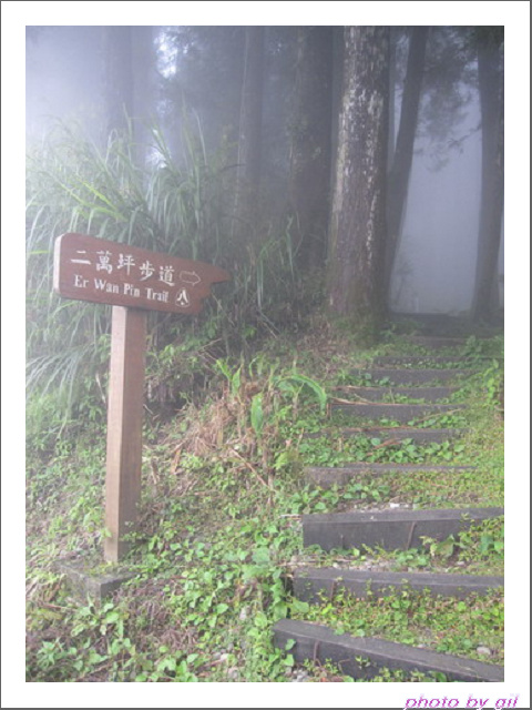 二萬坪步道全長約320公尺,人稱此為「黑森林」,此步道大概只需要10~15分鐘即可走完全程,是一條簡單卻很謐靜又原始的林間步道!步道的起點與終點皆位於森林鐵道旁,沿途會經過兩座紀念碑,一座是紀念因開拓森林鐵道而殉職的日本工程師「進藤雄之助」(近藤熊之助是阿里山作業所技師,專督阿里山鐵道修築相關問題,於1914年列車運轉測試時,在平遮那翻車受傷,送醫不治,因此立碑紀念。),另一座則是紀念森林測量員「二宮英雄」;由於此步道鮮有人跡,綠林、落葉與苔癬占據林間每個角落,也因此保存一份了最最原始的大自然林貌!不禁讓人愛上此處的幽靜。在鬱鬱的林木中,二萬坪步道貫穿林間,從鐵道旁的森林步道起點進入,立即感受到「黑森林」的由來,一棵棵高聳的柳杉直入雲霄,濃密的樹稍遮掩了陽光的投射,彷彿在護衛著不讓外界所干擾,尤其清晨隻身漫步其中,杉林的迷霧纏繞全身,吸汲大自然的芬多精,全身舒暢!