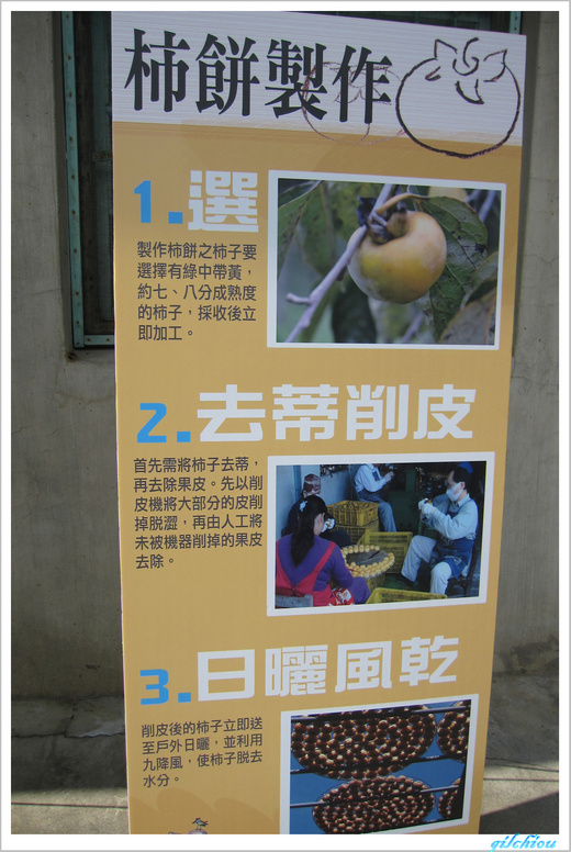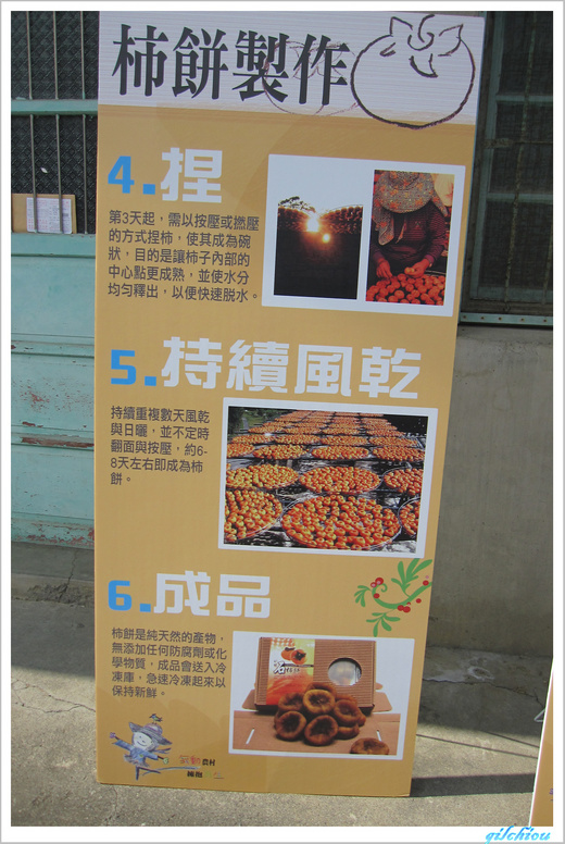 做柿餅聽說很辛苦,也是非常繁複的而那種辛苦若非身歷其境,真的無法體會。現在只能大概的把製作過程約略介紹,不過這尚要考慮到當天製造的天候及時間而有所調整,因此在製作上都繪有些許的差異,譬如雨天所削的柿青和晴天所削的步驟上就稍稍有所變化,早上和下午削的考量日照時間長短這也有差異,諸多的因素做出來的柿餅也多多少有所差異,不過柿餅製作的過程大約是:選果去蒂→洗淨→瀝乾→削皮→日曬→催熟→日曬→捻壓(打手)→催熟→殺菌(硫燻)→日曬→捻壓(打手)→日曬→捻壓(打手)→整形→殺菌(硫燻)→包裝→冷凍。