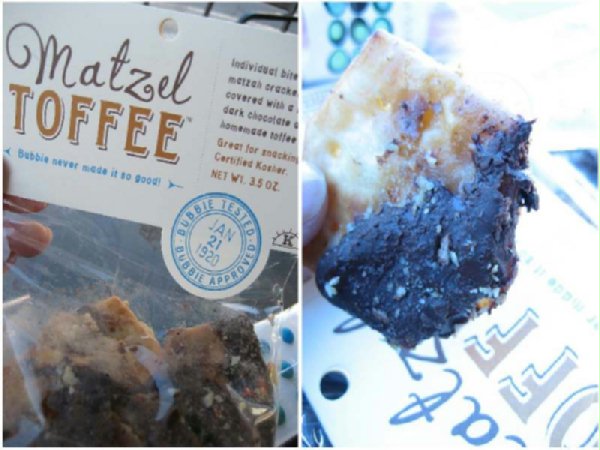 我試吃過caramel pretzels之後馬上就想起野人一定很愛,只是他們不賣單位只賣整盒只好作罷!這種外裹巧克力的小點一咬下去之後,內層有半是脆的半是軟甜的,不過相當甜並不合我口味。我只好轉向Matzel Toffee,這是一位叫做Mollie的舊金山老太太家傳食譜,至今她仍每週製作這小點。我一拿回家,野人就說這是猶太小點。我覺得很好吃,因為裹著巧克力的matzo crackers沾過toffee並不會過脆。