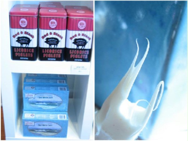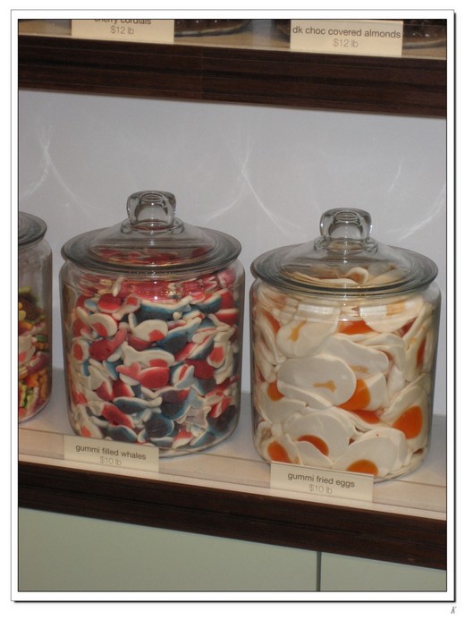 櫃面上一排排黑色的licorice(甘草)吸引我。這裡有超過十五種以上的黑licorice滿足其粉絲者。我以前並沒有試過,只知道野人不喜歡。這裡最受歡迎的licorice是種白色脆皮狀裡面是licorice cream款叫做licorice chalk。我一試就頗喜歡這種不甜卻帶點鹹的小東西。另外有種淡咖啡色外裹細砂糖的licorice超軟糖也很不錯。這些算是很特別,因為當我坐叮噹車回到市中心的時候,請了駕駛員幾顆,兩個人從沒吃過但都大讚好,我因此不用付五元車資,嘻!