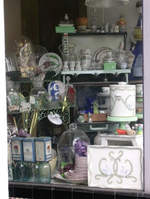 二手店是很多,但是二手餐具店我倒是第一次見到.我常常駐足觀看櫥窗,因為櫥窗裡塞滿各式餐具.有德州式掛籃,亞洲麻藤餐墊,美式經典白磁盤,華麗咖啡壺及珠花餐具套及燭臺.而裡面的餐具更是多到覺得會不小心弄倒的樣子,讓我處處很小心.
