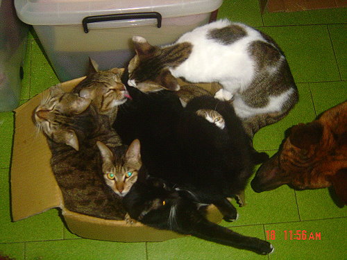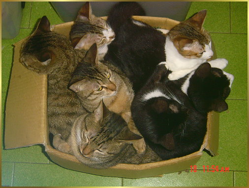 攝氏12度的夜晚,我和貓咪共眠一床,每隻貓都有五公斤重,我被壓得只好把牠們踢下去,可是等我睡著了,貓貓又跳上來,又把我壓的腳發痛,想另外做一張床給牠們,他們寧可擠紙盒子,這幾隻貓咪全擠進了一個紙盒的樣子,讓人看了會笑到肚子痛~!