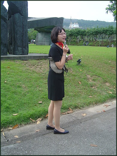 飽餐之後在要去看野柳的女王頭時,被朱銘美術館放在山下的招牌吸引了,我們決定先上山去拜訪朱銘的美術館,可是我在岔路走錯了,於是乎,一下子就走到鄧麗君的音樂墓園,墓園的前段加設了一只鋼琴,它的中央So已經壞了,想必設了有一些時間,我亦有十年之久沒來此地,看看墓園四周增添了一座沙漠植物園,種的仙人掌正在開花,乍看之下還很像紙花,另一位娘還直嚷著:『這是假花!』。聽了幾首歌後,我們心中那股陰氣也散了,禮貌的欷虛了幾聲,接著便繞回頭往下坡開去,高高興興的往美術館的方向回去。