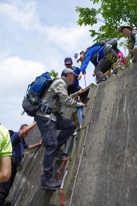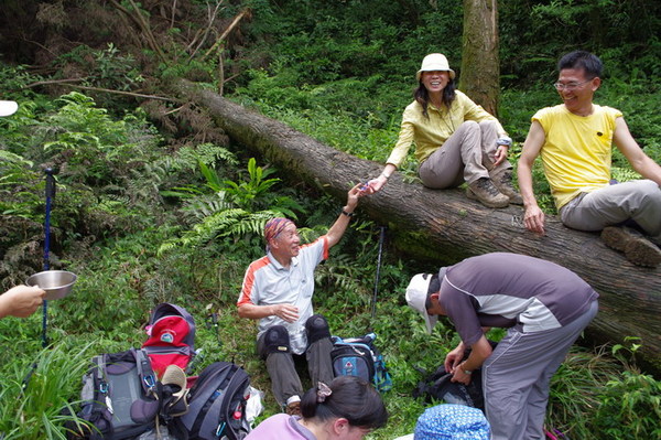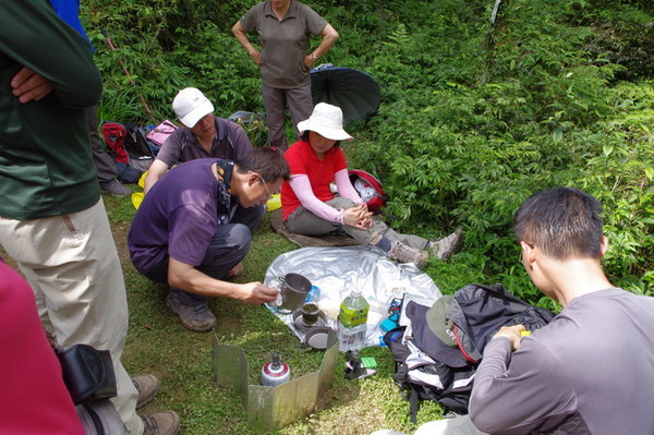 一路上因為悶熱潮濕,又無較寬廣的立足點,也無展望,所以大家都埋頭苦幹前進,較少長時間休息...12點多到達今天繼續上攻與下山回家的交叉點,中午也是在此開伙,蘇教授發送了好幾包坐船來(國外)的餅乾,大家順便整裝休息一下,除了不必要的東西不帶上去,也會有部分伙伴留在這裡料理中餐,等著攻頂的人下山回來休息使用: