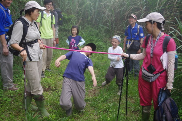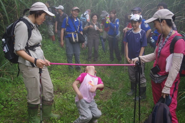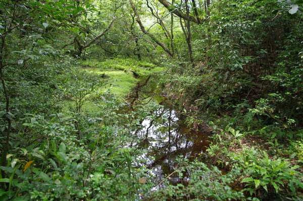 休息片刻,約3分之2的夥伴繼續上攻,不一會兒遇到一個小池塘,蛙鳴不斷,想必是生態豐富,不過別看它不起眼,若經過時不踩在狹小的木頭上,我實測過(其實是當時不專心啦),整隻雨鞋都會陷進去的...