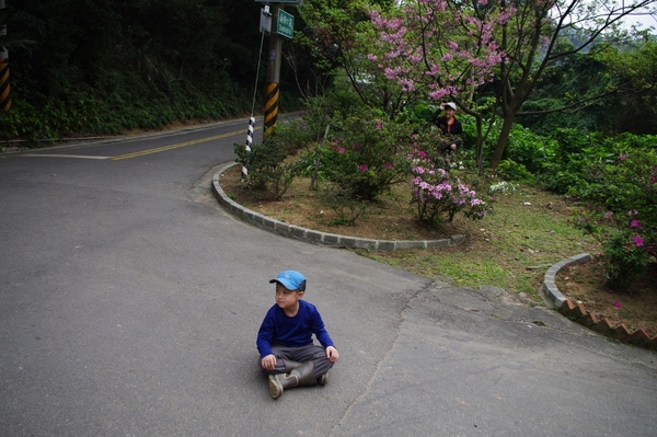接到了柏油路,"堯堯"隨地盤坐,休息一下,山上沒啥車,輕鬆自在: