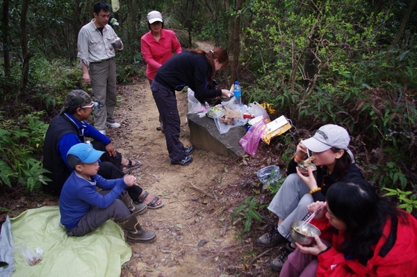 12:05直接在步道上就地休息用餐,雖然講好午餐自理+熟食分享,"浪子"還是準備了一大把黃麵來煮一鍋肉羹麵,味道很道地,我只能說,只要有"浪子"在,就算是午餐自理,也一定會有意外的驚喜啦 :