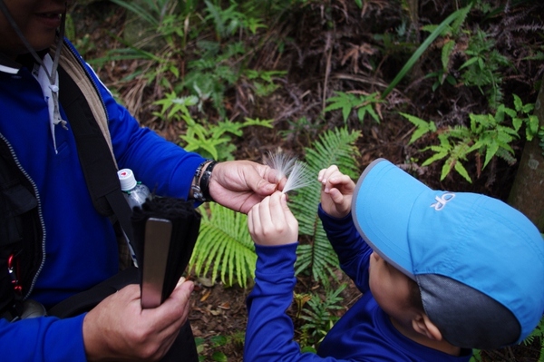 吃飽喝足,天空似乎也飄起小雨,催促著我們繼續上路,走沒多久,地上發現成群好似羽毛的植物,美麗有可愛,"堯堯"也拿著玩,愛不釋手: