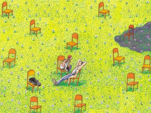 我驚訝地發現他在1998年才開始創作,那時他已40歲。「森林裡的秘密」是他的第一本書,他在畫畫時將病痛忘記,他要把握在身體健康時,還能創造甚麼美好的事,他極細膩的心思和感情,給自己揮灑的空間,他只要心之所嚮,他做過的夢、聽過的故事、看過的書、讀的詩、想像的世界……從1998年「微笑的魚」,1999年「向左走向右走」…2001年「地下鐵」2002年「布瓜的世界」…2007年「我的錯都大人的錯」。