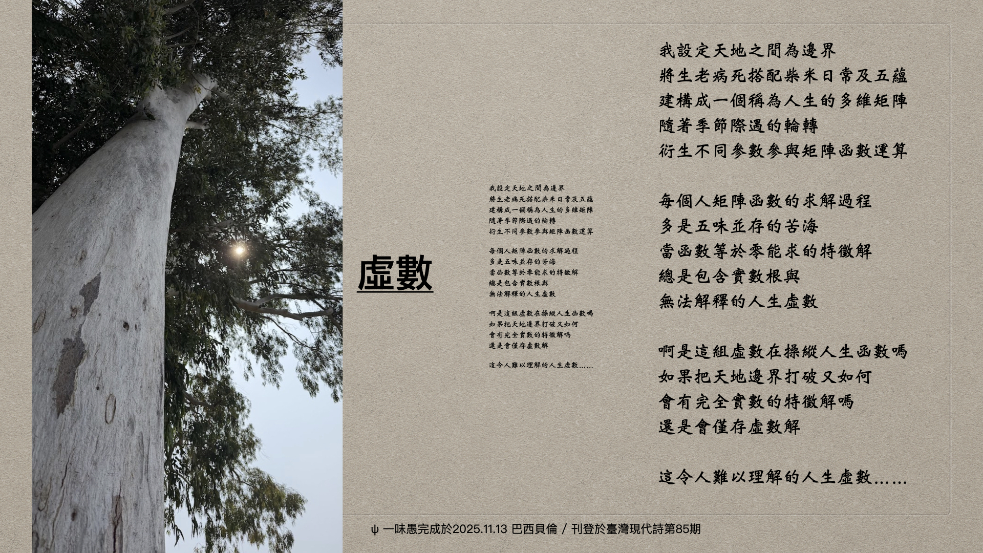 我設定天地之間為邊界 將生老病死搭配柴米日常及五蘊 建構成一個稱為人生的多維矩陣 隨著季節際遇的輪轉 衍生不同參數參與矩陣函數運算 每個人矩陣函數的求解過程 多是五味並存的苦海 當函數等於零能求的特徵...