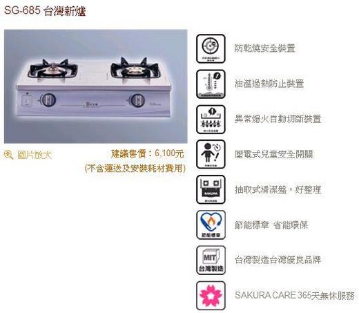 櫻花牌瓦斯爐防乾燒安全SG-685(節能)★送全省安裝