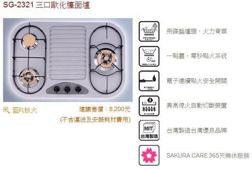 SG-2321 櫻花牌瓦斯爐歐化三口安全 檯面